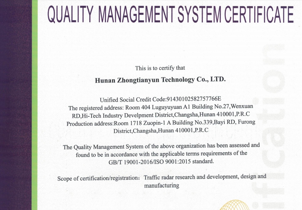 ZTRadar Technology has obtained plenty of approval certificates for both product and management. The company has been certified on ISO 9001:2015 standard. The product designed and manufactured in ZTRadar Technology can be trusted always for its reliability from the certifications.